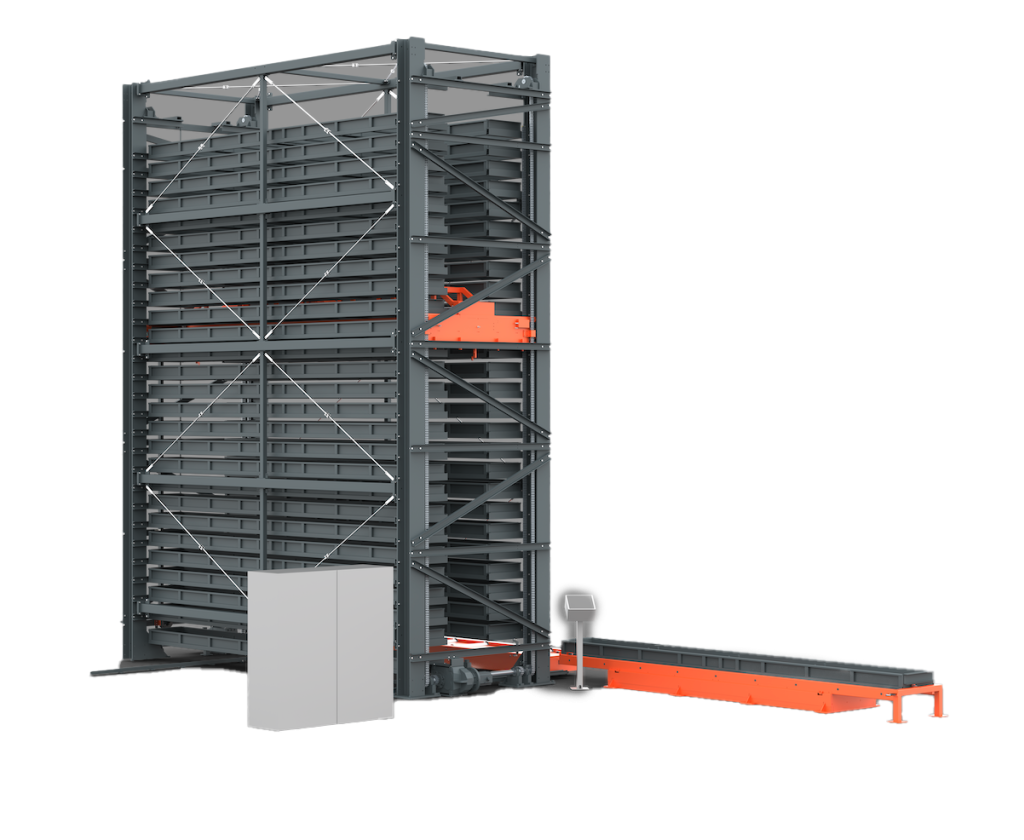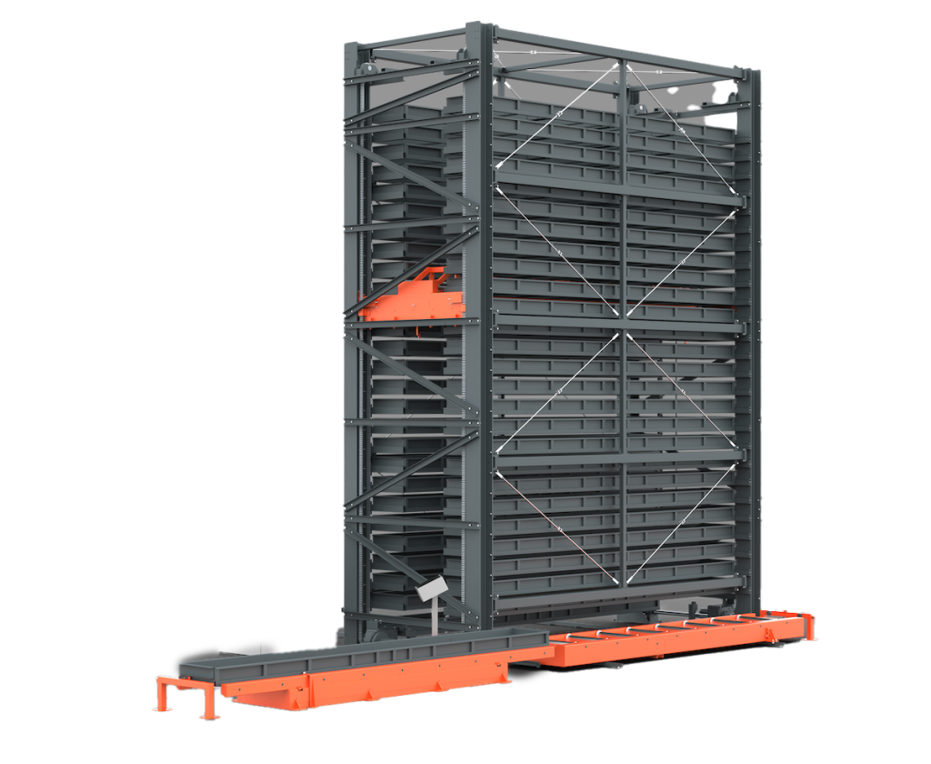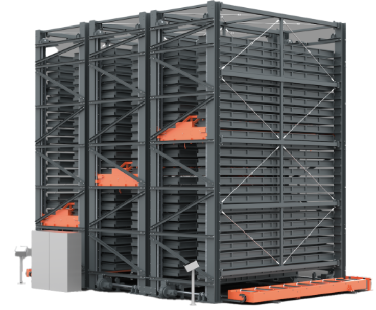 Çıkışa hazır kasetleri ana konuma çeker veya yüklemeye hazır kasetleri kuleye iter. Paletsiz depolama özelliği sayesinde minimum alanda maksimum kapasite sunar.